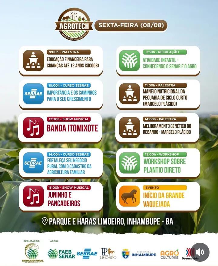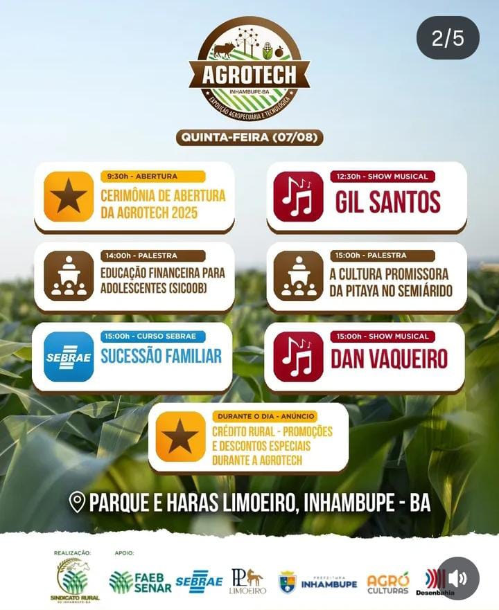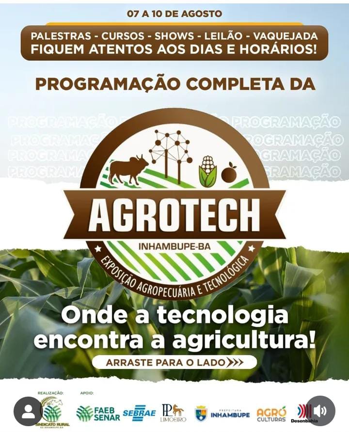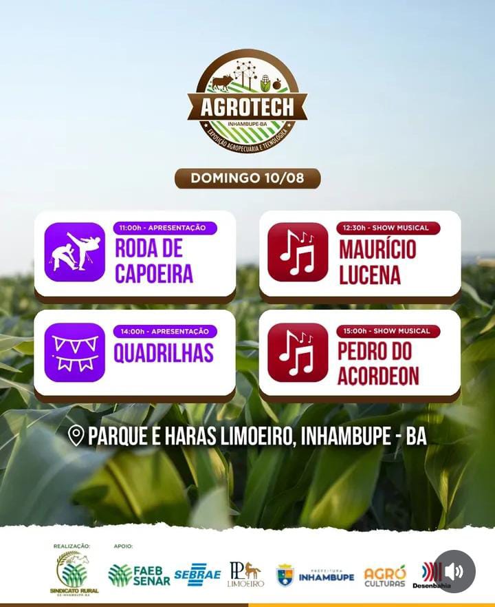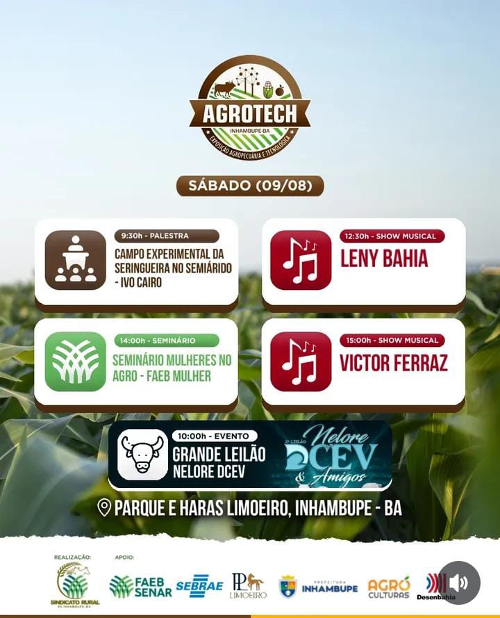 Promovida pelo Sindicato dos Produtores Rurais de Inhambupe, sob a liderança do presidente Tonho Leal, a Agrotech é gratuita e aberta ao público, com o objetivo de fortalecer a agricultura familiar, apresentar inovações tecnológicas e promover o desenvolvimento do agronegócio na região. Tonho Leal tem se destacado por sua atuação firme em defesa dos produtores locais, sendo peça fundamental na construção da feira. A programação da Agrotech 2025 segue até o próximo domingo, 10 de agosto, com uma ampla grade de atividades: dinâmicas de máquinas e implementos agrícolas, feira da agricultura familiar, palestras técnicas, exposição de cavalos, bovinos, caprinos e ovinos, praça de alimentação, espaço infantil, vaquejada, shows e outras atrações.