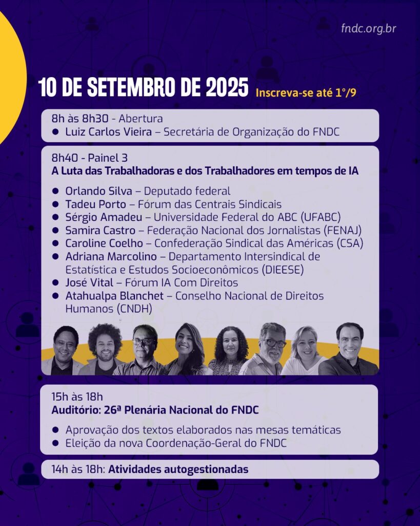 Na programação, estão previstos debates sobre democratização da comunicação, regulação das grandes plataformas digitais e fortalecimento de políticas públicas para garantir o direito à comunicação como um direito humano. No último dia do encontro, será realizada também a 26ª Plenária Nacional do FNDC.