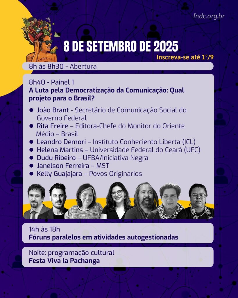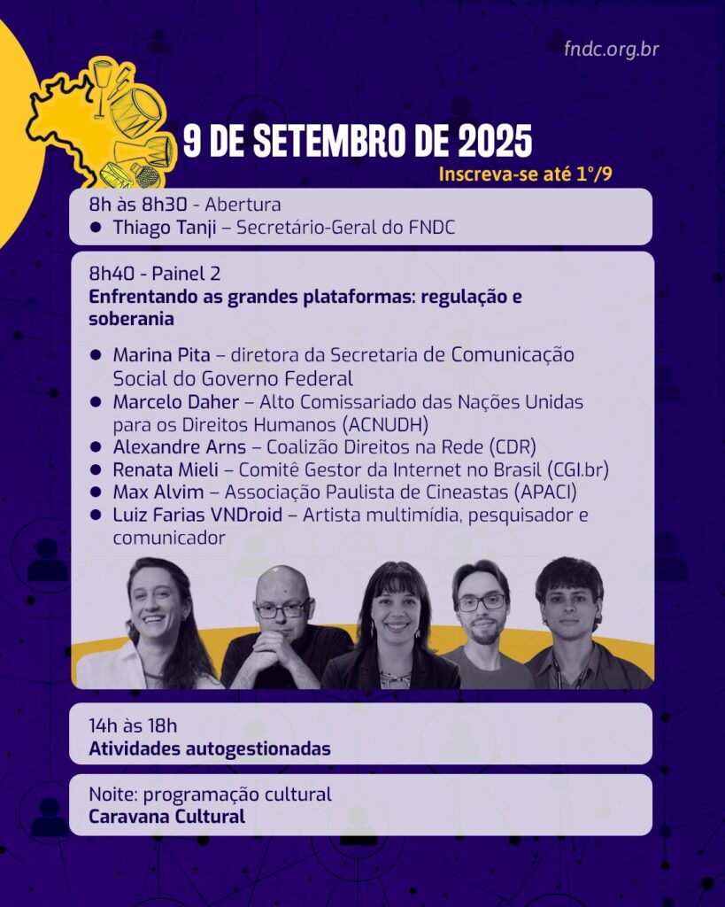 Segundo a organização, o evento busca construir propostas coletivas que reforcem a participação da sociedade civil na formulação e gestão de políticas públicas voltadas para a área. Temas como o enfrentamento aos monopólios da informação, os impactos socioambientais ligados aos conglomerados de tecnologia e os desafios enfrentados pelos coletivos independentes de mídia também estarão em destaque.