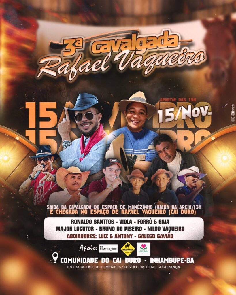 No próximo dia 15 de novembro, o povoado de Cai Duro, em Inhambupe, será palco de uma grande celebração da cultura sertaneja: a 3ª Cavalgada Rafael Vaqueiro. O evento promete reunir cavaleiros, amazonas e admiradores da tradição nordestina em um dia repleto de alegria, música e integração. A concentração será no Espaço de Manezinho, localizado no povoado de Mandacaru, com saída marcada para as 13h. O percurso seguirá pelas estradas da região, oferecendo um belo cenário do interior inhambupense e fortalecendo o espírito de amizade e união entre os participantes. A chegada está prevista para as 17h, no Espaço Rafael Vaqueiro, em Cai Duro, onde a festa continuará com muita animação, música ao vivo e o clima de confraternização típico das cavalgadas.