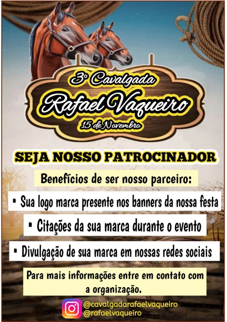 O evento é organizado por Rafael dos Reis Cruz, conhecido como Rafael Vaqueiro, que reforça o convite a todos os amantes da cultura do vaqueiro e do campo “É um prazer enorme realizar mais uma edição dessa cavalgada, que já se tornou uma tradição em nossa comunidade. É um momento de união, alegria e homenagem à nossa cultura. Esperamos todos vocês para celebrar conosco!”