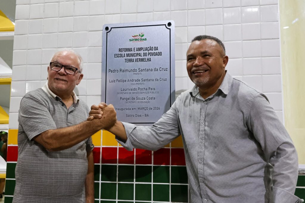 Na noite deste sábado, 28 de março de 2026, por volta das 19h, a Prefeitura de Sátiro Dias realizou a inauguração de uma nova escola no povoado de Terra Vermelha. A obra, entregue pela gestão do prefeito Pedrito Cruz, A cerimônia contou com a presença da primeira-dama e presidente da Câmara Municipal, Marta Cruz, do secretário de educação  Rangel de Souza, do vice-prefeito Felipe Cruz, Sua esposa a secretária de Assistência Social, Roseane Martins, o secretário de Administração, Wilker Cruz, além de outros secretários municipais, vereadores da base governista, lideranças comunitárias e moradores da região. O vereador do povoado, Zé Martins.