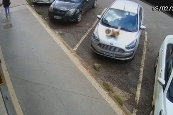 Um vídeo impressionante mostra o momento em que um cachorro despencou da janela do segundo andar de um prédio no Riacho Fundo 1. Barney, de três anos, caiu sobre o capô de um dos carros estacionados em frente ao edifício.
